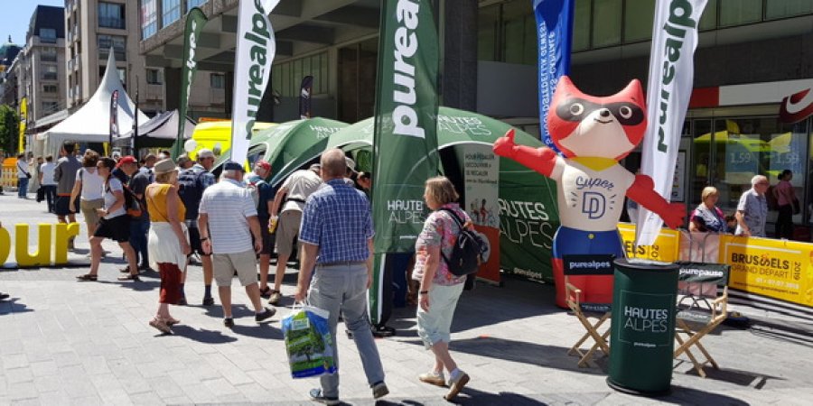 A l'occasion du Grand Départ du Tour de France, les Hautes-Alpes ont hissé leurs couleurs sur la Fan Park de la Place de Brouckère de Bruxelles.