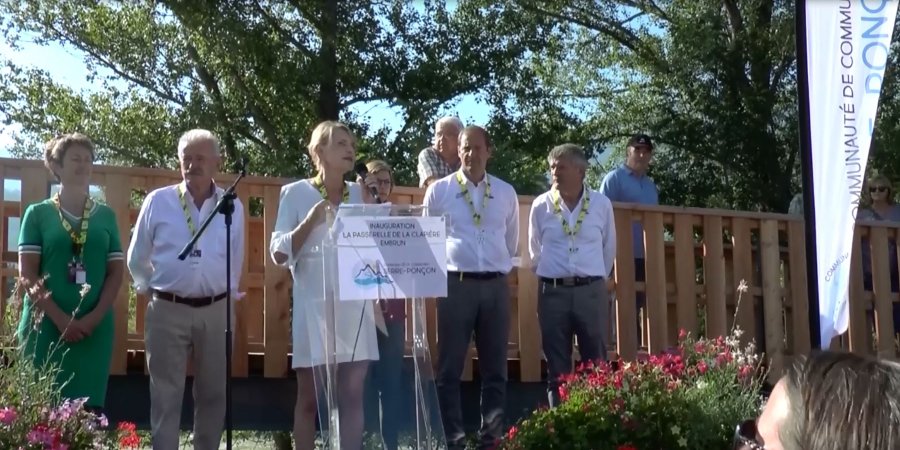 par Chantal Eyméoud, Maire d'Embrun et Présidente de la Communauté de Commune de l'Embrunais, la Préfète des Hautes-Alpes mais aussi le patron du Tour ou encore Bernard Thevenet.