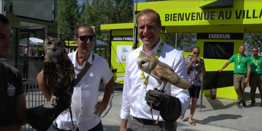 Moment savoureux au village départ d'Embrun ce jeudi matin lorsque les responsables du Parc Animalier de Serre-Ponçon ont présenté leurs fameux rapaces au patron du Tour Christian Prudhomme.