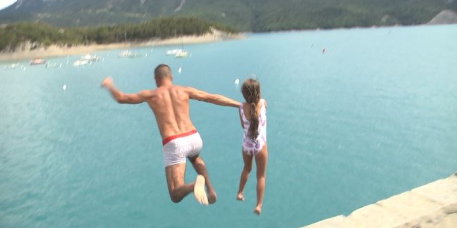 A toute chose malheur est bon ! Certes le niveau du lac de Serre-Ponçon est bien plus bas qu'à l'habitude ce qui va entraîner la fermeture des plages de Chadenas, des Crots et de Saint-Vincent les Forts mais tout le monde s'adapte. C'est le cas de ceux qui ont choisi la Baie de Chanteloube pour se baigner : ils ont transformé le célèbre viaduc à présent quasiment immergé en plongeoir !