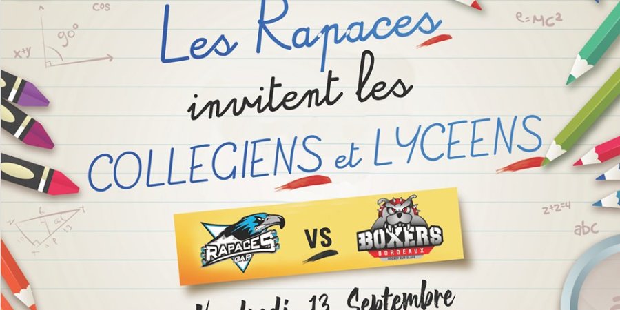 Les Rapaces sont heureux d'inviter tous les collégiens et les Lycéens des Hautes-Alpes au premier match officiel de Synerglace Ligue Magnus face aux Boxers de Bordeaux le vendredi 13 septembre à 20h30 à l'Alp'Arena.