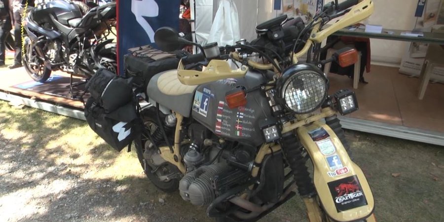 L'Alpes Aventures Moto Festival se déroule tout ce week-end à Barcelonnette. Il y a un stand qui se différencie des autres, c'est celui de Patrick, un motard aventurier qui à mené son fils de 14 ans dans le grand Nord sur plus de 13km sur sa moto, qui en compte plus de 200.000.