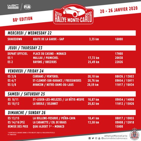 Mais le départ officiel du 88e Rallye Automobile Monte-Carlo sera donné le lendemain, jeudi 23 janvier à partir de 17h00 depuis la Place du Casino à Monaco. Au programme de cette première étape exclusivement nocturne, deux spéciales chronométrées bien connues des nostalgiques de l’épreuve, d’un total de 43,21 kilomètres.Disputées dans les départements des Alpes-de-Haute-Provence et des Hautes-Alpes, les épreuves de « Malijai / Puimichel » (ES 1 - 17,72 km - 20h38) et « Bayons / Bréziers » (ES 2 - 25,49 km - 22h26) seront d’entrée révélatrices pour les protagonistes du championnat.