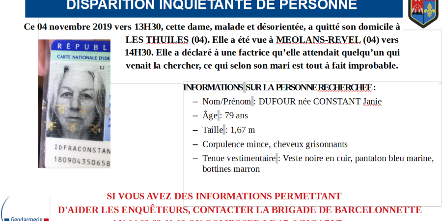 Il n'y a pour l'heure toujours aucune nouvelle. Janie Dufour (née Constant) est activement recherchée par les forces de l'ordre. Résidente de la commune des Thuiles, en Ubaye, elle a été vue pour la dernière vois à Méolans-Revel vers 14h30 ce lundi. Elle a déclaré à une factrice qu’elle attendait quelqu’un qui venait la chercher, ce qui, selon son mari, est tout à fait improbable. De nombreuses recherches sont actuellement engagées par les gendarmes et les hommes du PGHM.