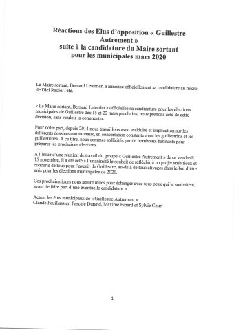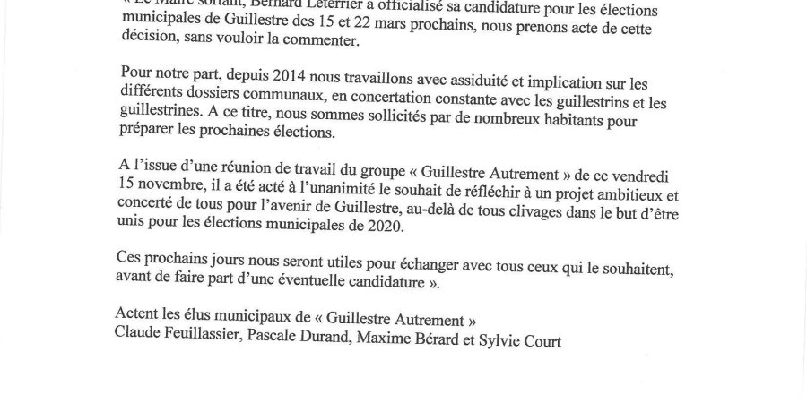 On se prépare à des élections municipales animées du côté de Guillestre. Le maire sortant est on le sait candidat mais il aura de l'adversité, celle du groupe "Guillestre Autrement " , dans l'opposition et au Conseil depuis 2014, qui se prépare à présenter une liste comme indiqué dans le communiqué ci joint.