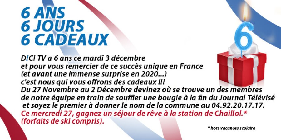 Le principe est simple : à la fin de nos journaux télévisés et sur dici.fr jusqu'à mardi une vidéo sera diffusée d'un de nos collaborateurs quelque part sur notre territoire, pour cela il vous donnera quelques indices afin de vous aider ! Le 1er à découvrir l'endroit où se trouve l'un des membres de l'équipe D!CI qui est entrain de souffler une bougie, téléphone et laisse un message avec le nom de la commune et ses coordonnées complètes au 04.92.20.17.17 et gagne un séjour de rêve.