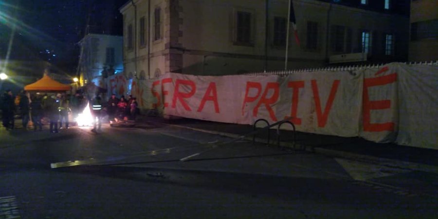 La préfecture de Gap est toujours bloquée par les Gilets jaunes ce vendredi matin. Après le mouvement social de ce jeudi, qui a réuni entre 2000 et 3000 personnes dans les rues de Gap, les Gilets jaunes avaient décidé de maintenir le siège de la préfecture pour la nuit. Bloquée par une grande banderole avec l'inscription "quand tout sera privé, on sera privé de tout", les manifestants ont mis en place un barrage routier et allumé des feux dans la rue.