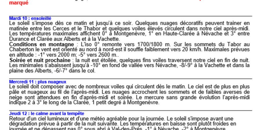 La Maison de la météo et du climat des Alpes du Sud vous propose de recevoir durant l'hiver les bulletins météo sur votre vallée ou vos stations préférées. Tous les matins par mail, informez-vous sur le temps qu'il va faire à Montgenèvre, Serre-Chevalier, Briançon, La Grave, Névache, Val-des-Prés, Embrun, Chateauroux, Savines, les Orres, Crévoux, Réallon. Inscription gratuite sur www.mmcas.fr. Retrouvez ces bulletins météo dans les offices de tourisme de Serre-Chevalier vallée Briançon, Serre-Ponçon, Montgenèvre, Val Clarée.
