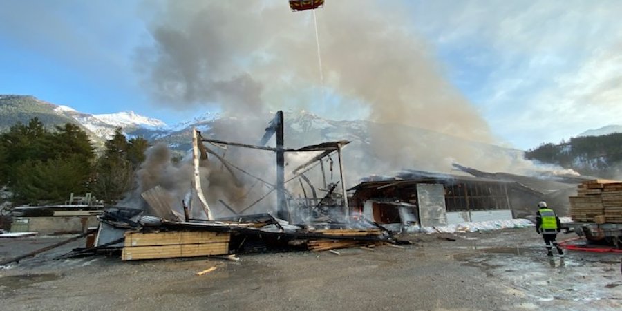 Un incendie impressionnant à détruit ce vendredi les ateliers de l'entreprise Alpes Méditerranée Charpente sur la commune de Saint Crépin près de Guillestre dans la zone d'activité des Hodouls. Les ateliers del' entreprise de Charpente se sont embrasés juste après 8h sur une surface de 1000 m² alors que les 13 employés commençaient leur journée de travail. C'est la partie atelier et production de l'entreprise Alpes Méditerranée Charpente qui est partie en fumée.