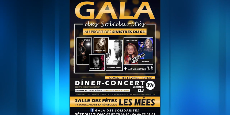 Les fonds récoltés seront directement reversés aux sinistrés des Alpes de Haute-Provence. Rendez-vous donc le samedi 1er février à partir de 14 heures pour l’après-midi solidaire et festive et à partir de 19 heures 30 pour le gala, à la salle des fêtes des Mées.