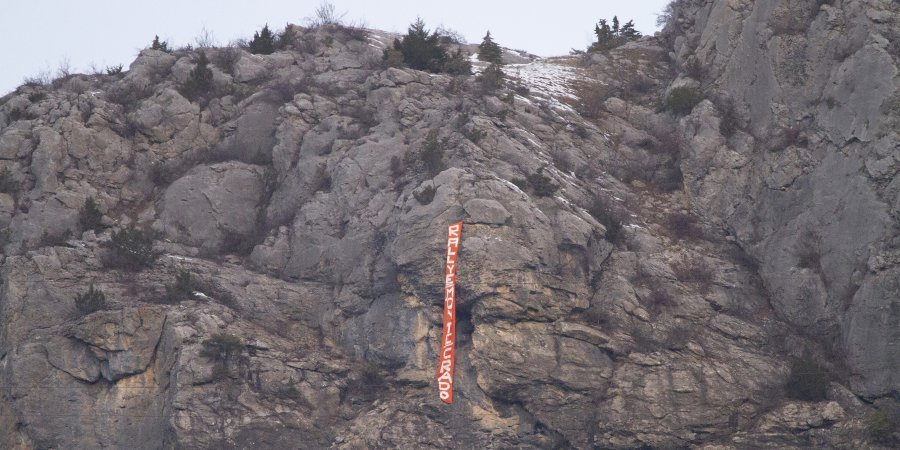 Action du collectif "Ras le rallye aujourd'hui sur la spéciale St Clément/ Freissinières avec un slogan HONTE-ALPES ou encore Rallye Monte-Crado.