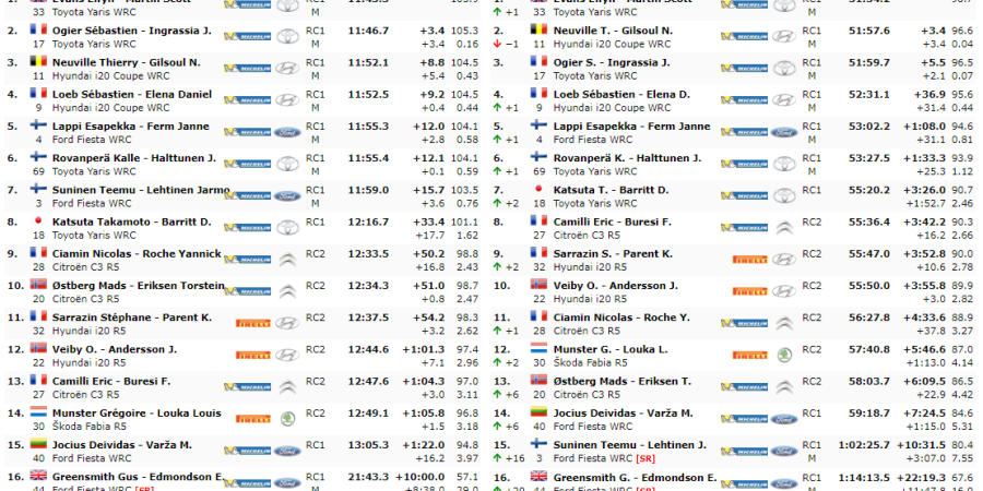 Au classement général Elfyn Evans s'empare de la tête du rallye devant Thierry Neuville et Sébastien Ogier, pour l'instant 3e du rallye. Sébastien Loeb est 4e.