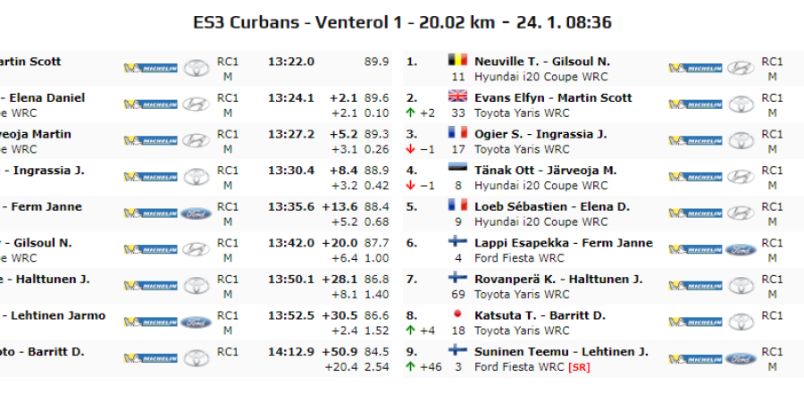 Rallye Monte-Carlo : C'est parti sur des chapeaux de roues pour cette troisième spéciale du 88e rallye Monte-Carlo entre Curbans et Venterol. C'est Elfyn Evans qui est en tête sur sa Toyota devant Sébastien Loeb qui a réalisé un beau deuxième temps. Le champion du monde en titre Ott Tanak est 3e. Sébastien Ogier a réalisé le 4e temps. Notez enfin la 6e place pour le leader du rallye Thierry Neuville qui a du redémarrer à un moment donné au cours de la spéciale.