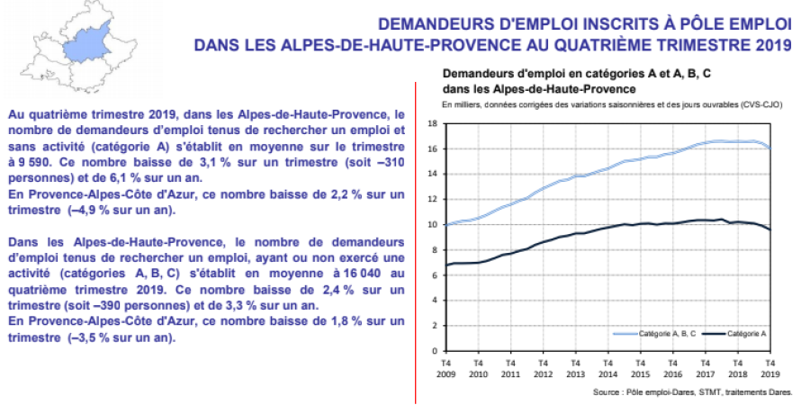 Dans les Alpes de Haute-Provence, la baisse est plus conséquente. Le nombre de demandeurs d'emploi recule de 3,1 % sur un trimestre pour s'établir à 9 590 personnes soit 310 chômeurs de moins. Sur un an, la baisse est encore plus significative avec 6,1 % de chômeurs en moins dans le département. Toutes catégories confondues, la baisse est de 2,4 % sur un trimestre et de 3,5 % sur un an.