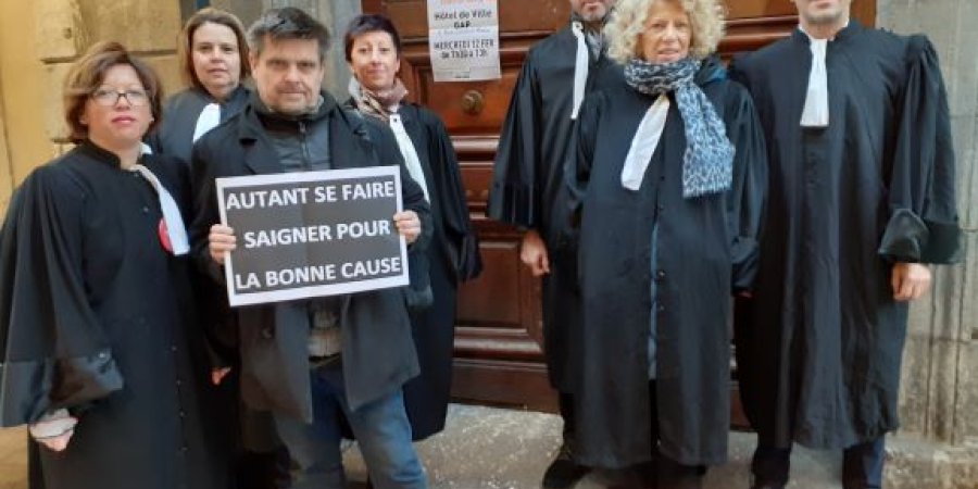 Hautes-Alpes : Les avocats toujours mobilisés contre la réforme des retraites. Ce matin, ils ont mené une nouvelle opération de protestation, symbolique, à l'hôtel de ville de Gap, à l'occasion du don du sang. "Quitte à se faire saigner, autant que ce soit de manière utile" : voilà en substance le message que voulaient faire passer la dizaine d'avocats haut-alpins, qui ont participé, en robe noire, à l'opération de don du sang qui se déroulait ce mercredi matin à l'hôtel de ville de Gap. Cette action symbolique s'inscrit dans le cadre de la mobilisation des avocats contre la réforme des retraites et la disparition de leur caisse autonome. En donnant leur sang, les avocats entendaient démontrer qu'ils sont bien solidaires, au-delà de leur mobilisation contre la réforme des retraites depuis plusieurs semaines. « Aujourd'hui, notre caisse autonome de retraite verse déjà entre 80 et 100 millions d'euros par an au régime général pour contribuer à son équilibre », rappelle le bâtonnier Priscillia Botrel. « Son absorption par le régime universel souhaitée par le gouvernement entraînerait le doublement des cotisations retraite pour les avocats et, dans le même temps, la diminution du montant moyen de la retraite versée. » L'augmentation des cotisations fragiliserait 40% des avocats, ce qui aurait des conséquences délétères sur la défense de proximité, a fortiori dans un département rural comme les Hautes-Alpes.