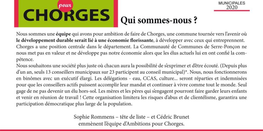 Hautes-Alpes : Il y aura bien finalement deux listes en lice pour les prochaines municipales à Chorges. La question était en suspens depuis le renoncement de la conseillère départementale Valérie Rossi. La liste est intitulée "Ambitions pour Chorges". Et c'est une autre femme finalement qui a pris la tête de liste de l'opposition cathurige. Il s'agit de Sophie Rommens. Elle se présente en binôme avec Cédric Brunet. Sophie Rommens avait déjà été adjointe à Chorges entre 2001 et 2008.