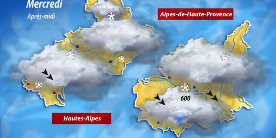 Le changement de temps risque d'être un peu brutal, mais nous allons retrouver un temps plus en accord avec la saison ce mercredi. La neige est attendue à des altitudes bien basses en cours de journée, jusqu'à 500/600 m. Les quantités s'annoncent tout même bien modestes avec un léger coup de blanc à quelques cm vers 700/800 m, 5 à 10 cm parfois vers 1000 m et au-dessus. Un peu plus en altitude sur les massifs proches de la Savoie et de l'Isère, il pourrait se déposer 15/20 cm, notamment du coté du col du Lautaret. Le vent sera également de la partie, Mistral et Bise vont se lever et souffler fort en montagne, parfois jusqu'à 50 km/h dans les vallées et les plaines exposées. Accalmie jeudi en matinée puis un nouveau passage perturbé va traverser les Alpes du Sud à partir de jeudi après-midi, apportant encore un peu de neige dans nos stations de ski.