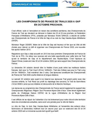 Conséquence de la crise, Gap a été choisie pour accueillir les Championnats de France de trails les 3 et 4 octobre 2020 à l'occasion du Trail Gapen'cimes.