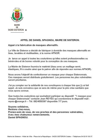 Anticiper, c'est le maître mot de cette crise, un mot qu'il faudra à l'avenir retenir et ça le maire de Sisteron le sait. La ville a décidé de lancer la fabrication de masques alternatifs en tissus, car même si le président de la république dans son discours ce lundi soir n'en a pas souligné l'obligation, il semble désormais que le port du masque soit un rempart pour lutter contre la propagation du covid-19. Ainsi le maire lance un appel à toutes les couturières et en quelques jours les réponses ne se sont pas faites attendre :