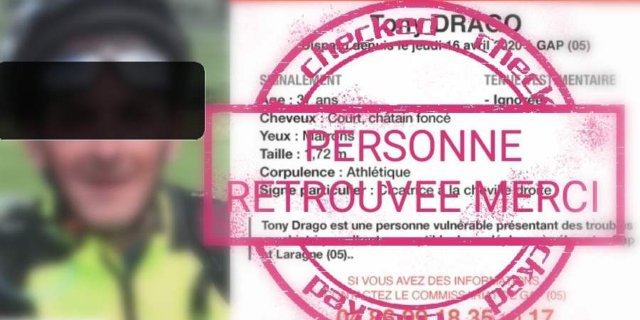 Hautes-Alpes : Tony Drago, disparu depuis le 16 avril à Gap a été retrouvé sain et sauf annonce ce vendredi matin la police nationale, qui avait émis un avis de recherche. Avis qui est désormais clôt. Tony Drago est une personne vulnérable qui présentaient des troubles psychiatriques.