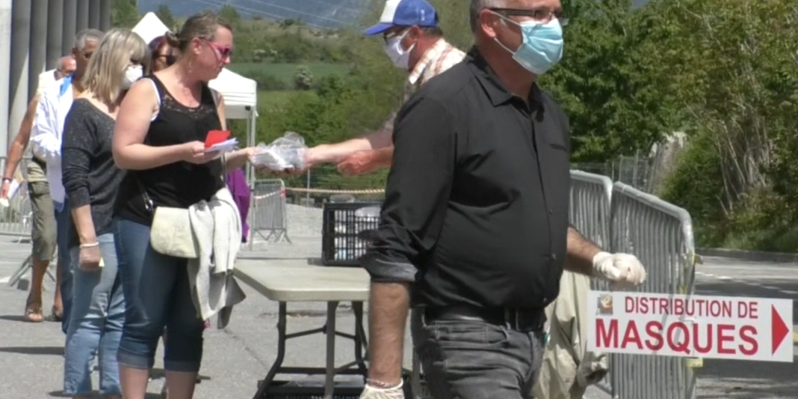 Hautes-Alpes : Plusieurs milliers de masques ont été distribués cet après-midi à Embrun, dans 6 sites différents. Il y avait énormément de monde présent pour récupérer les masques, à raison d'un par personne. Des masques chirurgicaux et des masques en tissu ont été distribués gratuitement aux habitants. Il y aura une nouvelle distribution la semaine prochaine. On retrouve sur place à Embrun, la maire Chantal Eyméoud et des habitants de la commune qui sont venus sur les points de distribution.