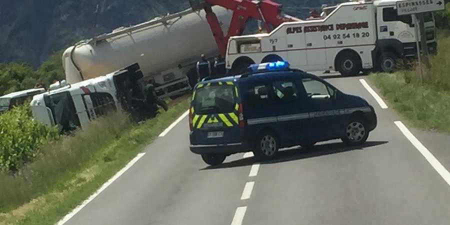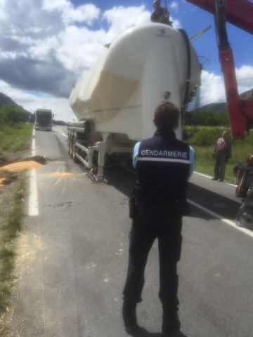 Mauvais moment pour ce chauffeur Italien sorti de la route ce lundi après-midi jutes à la sortie d'Espinasses. Le camion a été relevé non sans effort ce mardi. L'omportant; c'est bien sur de vous indiquer qu'il n' y a pas eu de blessé ni de pollution.
