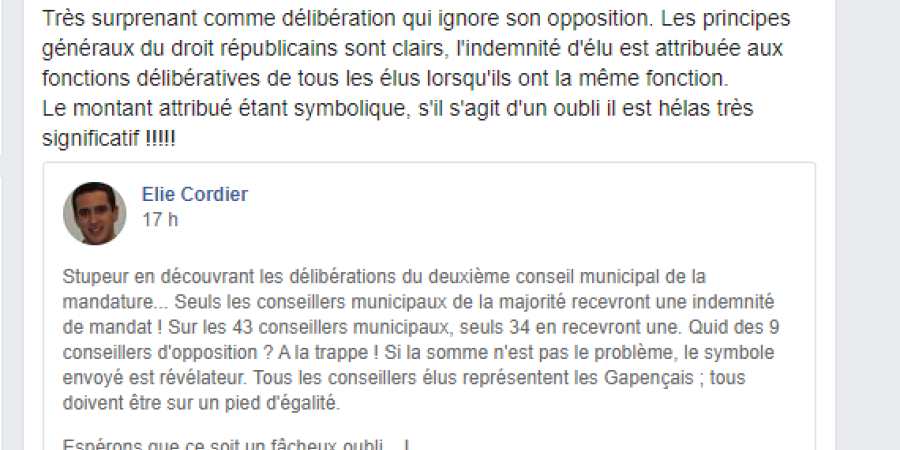 Hautes-Alpes : À chaque jour sa polémique à Gap et dans l'agglo. Après celle de la quasi absence de femmes aux postes de vice-présidente de l'agglomération Gap-Tallard-Durance, avec une seule élue de Gap choisie par Roger Didier pour occuper un poste de vice-présidente, ce sont les indemnités qui posent problème au conseil municipal de Gap. Une délibération vient d'octroyer des indemnités d'élus pour les seuls élus de la majorité. Ce qui fait bondir les opposants de Gap Autrement emmenés par Marie-José Allemand. Celle qui est arrivée troisième lors des élections municipales loin derrière Roger Didier élu dès le premier tour et Charlotte Kuentz, dénonce un mépris envers l'opposition : "L'équipe majoritaire fait fi des règles démocratiques en s'arrogeant des indemnités d'élus et en ignorant son opposition. Le Maire s'assoit ainsi sur les textes de loi et les principes du droit républicain qui précisent que l'indemnité d'élu est attribuée aux fonctions délibératives de tous les élus municipaux qu'ils soient de la majorité ou de l'opposition. C'est d'autant plus regrettable qu'il sera obligé de s'y soumettre par le contrôle de légalité de la préfecture. S'il s'agit d'un simple oubli, il est d'autant plus significatif..." conclut Marie-José Allemand.