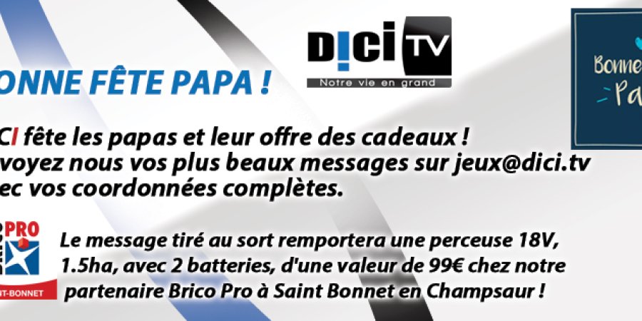 Ce papa se verra offrir une perceuse 18Volt, avec 2 batteries, d'une valeur de 99€ chez notre partenaire Brico Pro à Saint Bonnet en Champsaur et deux places pour une séance au cinéma le Palace à Gap !