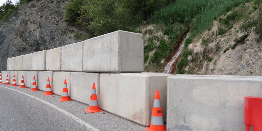 arrêté par des blocs béton installés en bord de route, nécessitant depuis un alternat de la