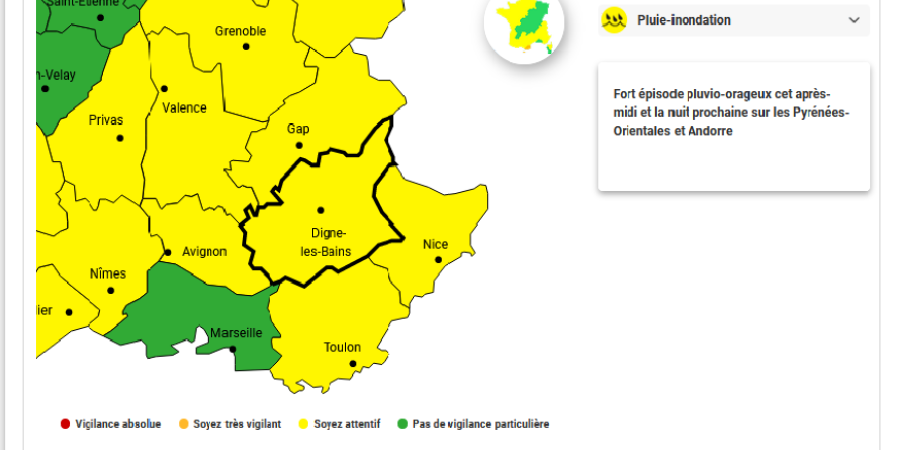 Météo-France place le département des Alpes-de-haute-Provence en vigilance jaune, orages pluie-inondation, ce vendredi après-midi et jusqu'à samedi matin. Cette vigilance pourrait être prolongée durant la journée de samedi en raison des forts cumuls de pluie qui sont attendus sur le massif alpin après une très longue période de sécheresse.