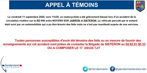 Dans le cadre d'un grave accident de la circulation routière survenu ce vendredi sur le secteur de Sisteron, la gendarmerie des Alpes de Haute-Provence a lancé un appel à témoin afin de déterminer les circonstances de l'accident.