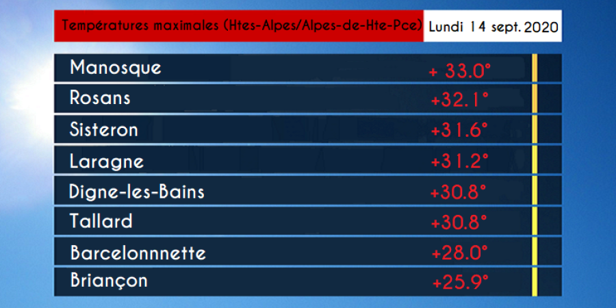 Alors que des records sont tombés un peu partout dans l'ouest et le centre de la France, les Alpes du Sud enregistrent des températures de 6 à 7° au-dessus des normales, mais aucun record mensuel n'est tombé. La station de Saint-Auban dans les Alpes-de-haute-Provence enregistre ce lundi 14 septembre une température maximale de 31,3°C, loin du record mensuel de septembre qui date de 1982 avec 34°. Il n'en reste pas moins que cette température se situe 7° au-dessus de la normale de saison. Pareil pour la station Météo-France d'Embrun qui relève ce jour 29.9°C, le record datant du 4 septembre 2006 avec 32.4°, là aussi cette température de 29.9°C est de +7° supérieure à la normale de saison. Les températures de 30° ou plus ne sont pas exceptionnelles sur nos départements. Depuis 1975, on observe 26 mois de septembre ou la température atteint les 30°C à Embrun, dont 8 ou cette valeur est relevée après le 15 septembre. La valeur la plus tardive sur Embrun s'est produite le 25 septembre 1983. A Saint-Auban la valeur des 30° est quasiment habituelle en septembre avec 40 mois de septembre depuis 1975 ou l'on a atteint ces 30°, dont 12 après le 15 septembre. Et comme pour Embrun la valeur la plus tardive à Saint-Auban date du 25 septembre 1983.