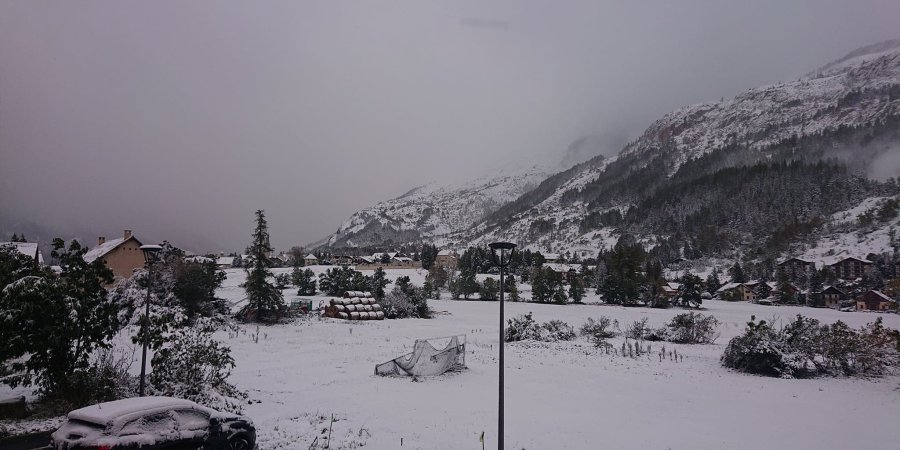La neige est descendue jusque dans la vallée de la Guisane depuis hier soir, et ce matin on relevait 7 cm de neige au cœur du village du Monêtier les Bains, le vent a soufflé en rafales et souffle encore, mais pas de neige sur la route à cette heure.