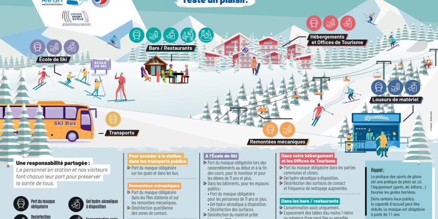 La pratique des sports de glisse est une pratique de plein air, où l’équipement (gants, ski, bâtons...) favorise les gestes barrières. Dans certains lieux publics, la capacité d’accueil peut être réduite. Le masque est obligatoire à partir de 11 ans. Vous trouverez ci-dessous les mesures de protection mises en place lors de votre parcours en station.