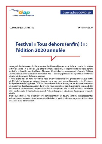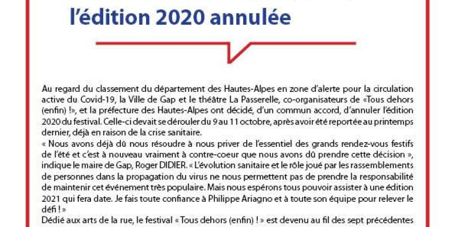 La mairie de Gap annonce ce jeudi que l'édition 2020 du festival "Tous dehors (enfin !)" qui devait se tenir du 9 au 11 octobre prochain a finalement été annulée au vu de la situation sanitaire détériorée dans le département des Hautes-Alpes.