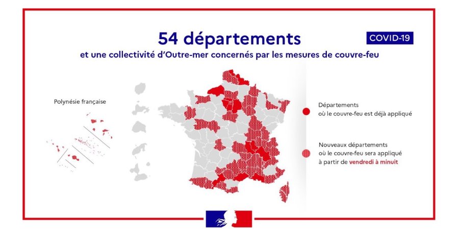 46 millions de Français sous couvre-feu et 54 départements concernés, dont 38 nouveaux et la Polynésie. Des règles en place dès ce vendredi soir minuit.