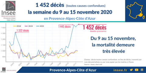 Entre le 1ᵉʳ septembre et le 16 novembre, 12 961 décès, toutes causes confondues,ont été enregistrés dans la région Sud/Paca, soit 21 % de + qu’en 2019. Au cours de la semaine du 9 au 15 novembre, le nombre de décès reste très élevé et s'est encore accru légèrement par rapport à la semaine précédente.
