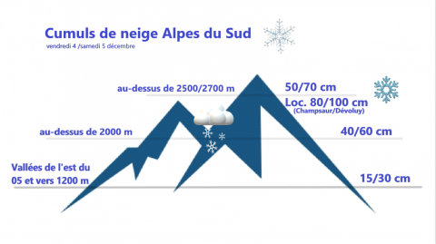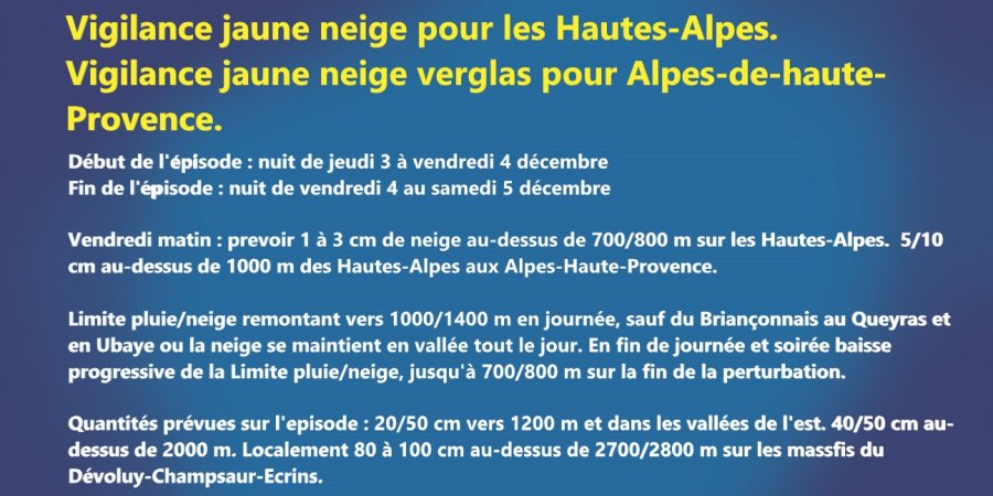 Nos deux départements alpins sont d'ores et déjà placés en vigilance jaune neige pour le 05 et neige et verglas pour le 04, en prévision du mauvais temps prévu à partir de cette nuit. L'épisode pluvio-neigeux qui va débuter la nuit prochaine va se poursuivre jusque durant la nuit de vendredi à samedi. Ce vendredi matin, quelques cm de neige pourraient tomber jusqu'à 700 à 800 m d'altitude puis la limite pluie/neige remontera vers 1000 à 1400 m sur les Alpes du Sud, sauf sur l'est des Hautes-Alpes et l'Ubaye ou la neige se maintiendra en vallée tout le jour. Cette LPN baissera de nouveau en fin de journée de vendredi et durant la nuit suivante sur la fin de la perturbation vers 700 à 800 m. On attend 20 à 50 cm de neige dans les vallées du Briançonnais au Queyras et en Ubaye, ainsi qu'au-dessus de 1200 m. 40 à 60 cm au-dessus de 2000 m et localement 80 cm jusqu'à 1 m de neige fraiche en altitude au-dessus de 2700/2800 m sur le Dévoluy-Champsaur- Écrins. La circulation s'annonce compliquée sur le réseau routier d'altitude.