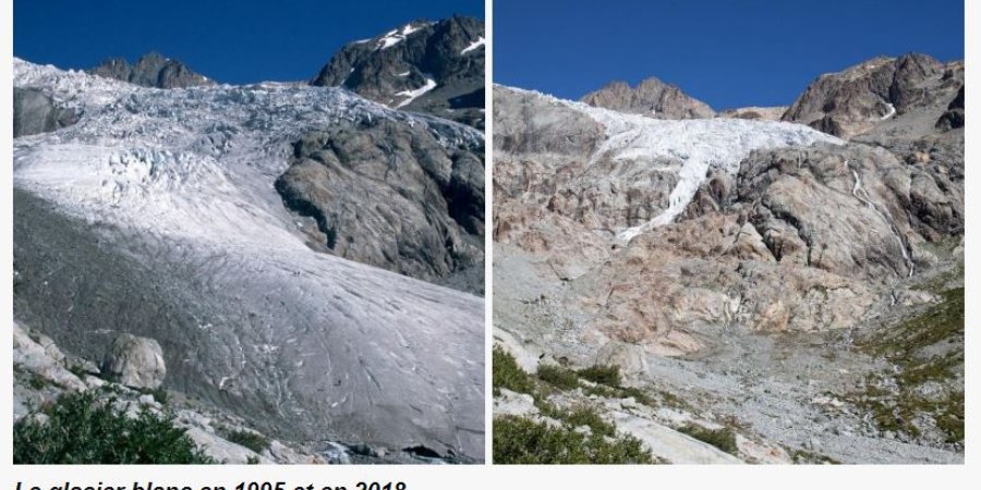 Dans les Alpes du Sud, l'impact du changement climatique se mesure un peu plus tous les ans. Depuis les années 80 la température moyenne approche les 1,5°C de hausse. Les accords de Paris lors de la COP21 en 2015 pour limiter la hausse des températures à 1.5° sont largement atteint chez nous. Les coulées de boue sont plus régulières et plus violentes dans la Clarée, la Haute-Ubaye, le Champsaur. La fonte des glaciers des Écrins depuis 40 ans et franchement visible, qui pourrait le nier. Les canicules et sécheresses deviennent de plus en plus fréquentes. les épisodes méditerranéens de plus en plus violents. L'enneigement de plus en plus irrégulier est en nette baisse. La fonte du permafrost de montagne a des conséquences réellement visibles depuis une dizaine d'années et les glaciers rocheux se mettent en mouvement dans la montagne. Le Glacier Blanc est devenu en 2019 le glacier sentinelle du changement climatique pour le massif alpin du sud. Jusque là et depuis 40 ans le Glacier de Sarenne jouait ce rôle, mais voilà ce dernier à fondu et n'est plus qu'un petit névé d'altitude de fin d'été. Alors on fait quoi ???? (extrait du documentaire "Une montagne sans glacier" réalisé en 2019 par Christophe Adon, sur le changement climatique dans les Alpes du Sud)