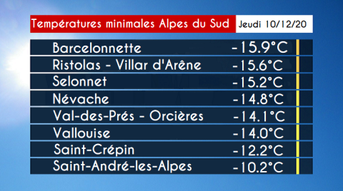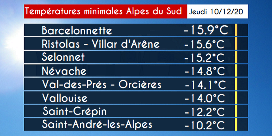 Nuit claire, temps calme, sols enneigés, le cocktail parfait pour que le rayonnement nocturne fasse plonger les températures sous les -10 à -15°C dans les hautes-vallées alpines.