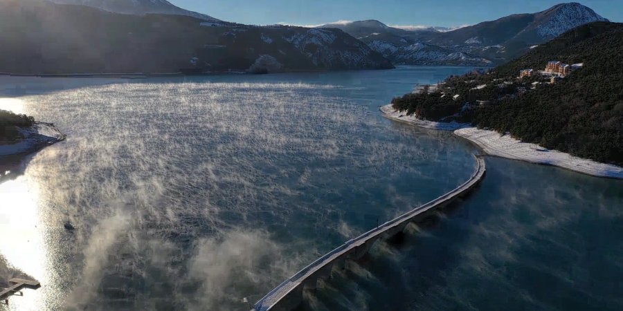 C'est le lac de Serre Ponçon que nous vous montrons dans un cadre enchanteur, et plus précisemment la baie de Chanteloube. La fraîcheur du matin et les reflets d'hiver du soleil sur la surface de l'eau ne laissent planer aucun doute : l'hiver arrive à grands pas !