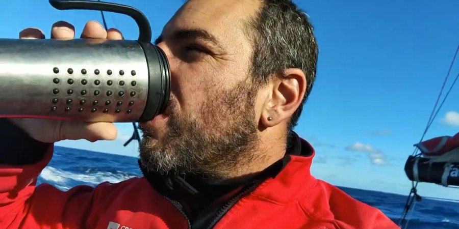 Damien Seguin a profité de ce dimanche pour s'accorder une pause détente sur le pont de son bateau Apicil, une tasse de thé à la main :
