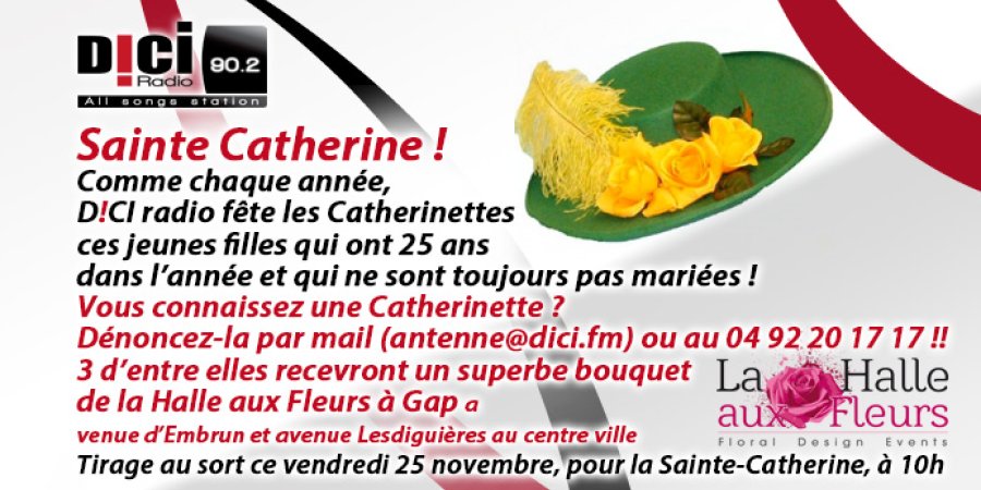 Dénoncez(!) les Catherinettes de votre entourage (les jeunes filles de 25 ans et toujours célibataires) sur antenne@dici.fm ou au 04 92 20 17 17 avant ce jeudi 24 novembre au soir en nous donnant leur nom, ville d'habitation et numéro de téléphone.