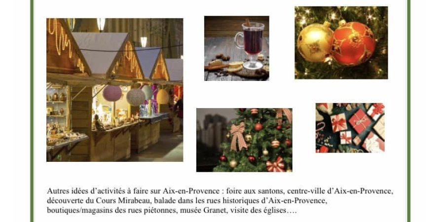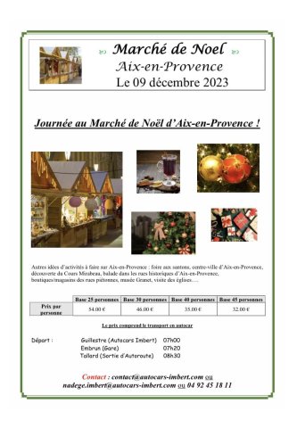 Les autocars Imbert vous proposent une sortie journée au Marché de Noël d’Aix-en-Provence le c ! Vous serez séduits par ses nombreux exposants, ses décorations et sa superbe foire aux santons.