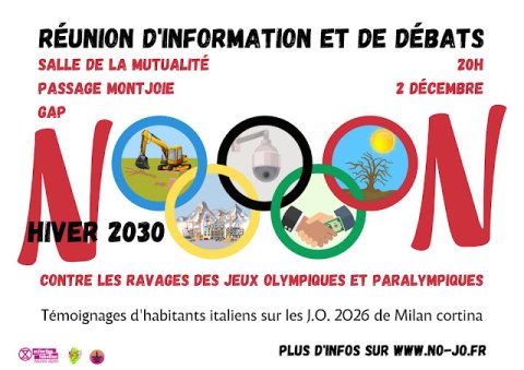 Deux réunions publiques du Collectif NO JO sont organisées dans les Hautes-Alpes cette semaine. Réunions d'Informations et de débats sur la candidature à l'organisation des JO "d'hiver" de 2030 avec les témoignages d'habitants de Milan et Cortina d'Ampezzo (Jeux olympiques d'hiver de 2026 en Italie)