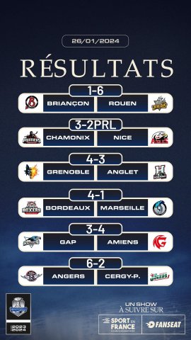 Un tiers a suffi à Grenoble pour faire la différence contre Anglet. Jere Rouhiainen ouvre le score pour les vainqueurs de la Coupe de France peu avant le quart d’heure de jeu. Craig Puffer relance l’Hormadi dans la foulée mais l’espoir est de courte durée. Les Brûleurs de Loups marquent deux buts coup sur coup par l’intermédiaire de Damien Fleury et Matias Bachelet. Flavian Dair poursuit le festival offensif isérois au retour des vestiaires. Les BDL s’arrêtent finalement à quatre buts et jouent même à se faire peur en encaissant deux buts dans le dernier tiers. Les réalisations de Craig Puffer et de Keith Getson, en powerplay à chaque fois, ne suffisent pas à empêcher la défaite des Basques.