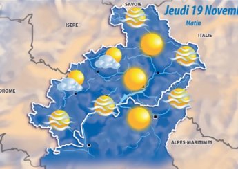Lire la suite de Alpes du Sud : La météo de ce Jeudi 19 Novembre 2015 SociétéAlpes du Sud : La météo de ce Jeudi 19 Novembre 2015 Alpes du Sud : La météo de ce Jeudi 19 Novembre 2015 JEUDI 19 ENSOLEILLÉ Le soleil reste largement prédominant,...météo