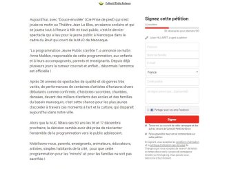 Lire la suite de Alpes de Haute-Provence : une pétition lancée "pour que continue la programmation Jeune Public au MJC de Manosque" CultureAlpes de Haute-Provence : une pétition lancée "pour que continue la programmation Jeune Public au MJC de Manosque"La programmation « Jeune Public » s'arrête à la MJC de Manosque qui fête ses 50 ans cette année. Depuis 1996, la maison...