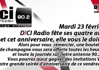 Lire la suite de Cette semaine sur D!CI ! : Pour son 4e anniversaire, D!CI Radio vous offre le champagne ! Info serviceCette semaine sur D!CI ! : Pour son 4e anniversaire, D!CI Radio vous offre le champagne ! Tout a commencé il y a 4 ans, place de Verdun. Beaucoup d'entre vous s'en souviennent ! C'était le début d'une...