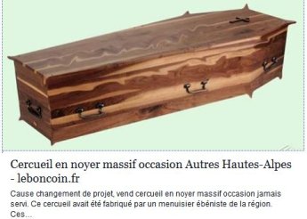 Lire la suite de Hautes-Alpes : Un cercueil a vendre dans le Buëch sur le bon coin... Une blague ? Info serviceHautes-Alpes : Un cercueil a vendre dans le Buëch sur le bon coin... Une blague ?Un cercueil est à vendre sur le bon coin à Trescléoux. On peut penser à une blague mais l'annonce a l'air sérieuse......